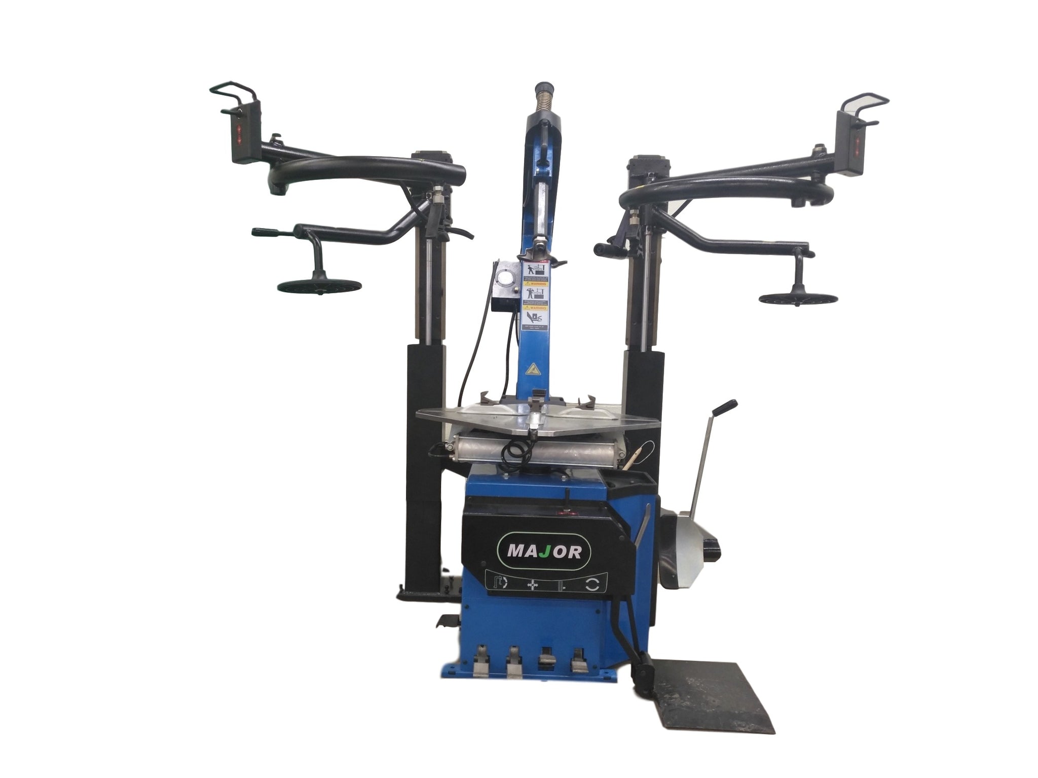 Our flagship tire changer machine with dual assist arms makes changing even run flat tires almost effortless. The tire changer LT-3980S is a tilt back style machine capable of 14-28” inside clamping and 12-26” outside clamping with built in bead blaster and up to 43” overall wheel diameters. Max wheel width is 15”. Each assist arm of this tire changer has a following arm and lifting disc, right side arm also has roller wheel to aid M/Demount head during install and can be used instead of bar and M/Demount head to remove final tire assembly from wheel simply tilt tower back and slide roller under tire to almost rim edge. Lift roller slowly while rotating table to remove tire. Dual lifting discs makes prying first bead of a run flat or low profile tires considerably easier. Simply apply lift to the tire with discs after bar is inserted into the tire then pry bead over M/Demount head. The lift on the tire (via discs) aids in prying upper bead of tire. Front wheel elevator is optional. Machine is powered via 110 volt 1.5 H.P. motor (Asynchronous) with maximum torque to change the toughest of tires with ease and compressed air max air pressure is 150 psi. Foot valves are aluminum (not plastic) for long maintenance free life.